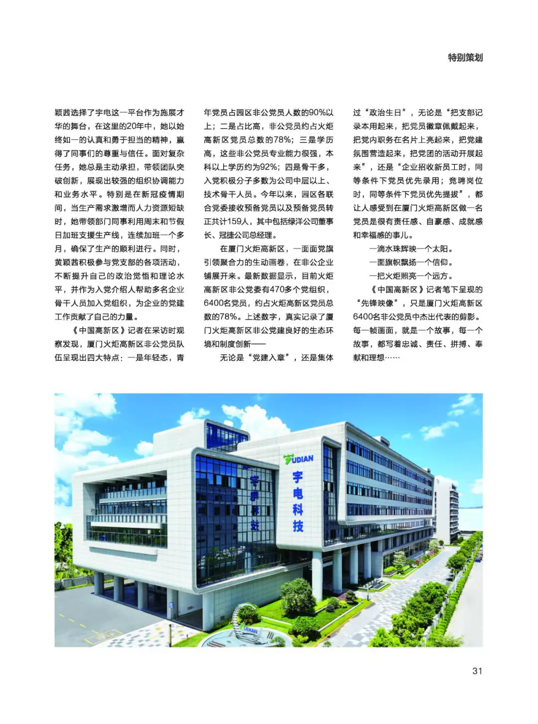 12月11日,《中國(guó)高新區(qū)》刊發(fā)《“火炬”新質(zhì)生產(chǎn)力的“先鋒映像”》的新聞報(bào)道,聚焦廈門(mén)火炬高新區(qū)非公黨員的杰出代表,其中宇電自動(dòng)化作為園區(qū)黨建工作優(yōu)秀企業(yè),得到了《中國(guó)高新區(qū)》雜志采訪(fǎng)肯定。