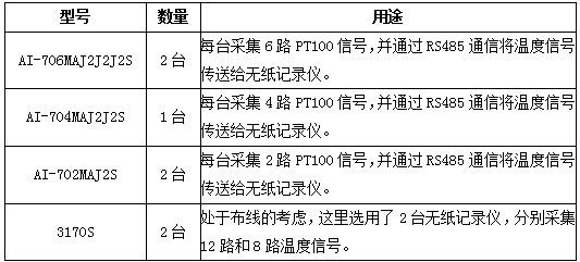 本監(jiān)控方案由PT100熱電阻溫度傳感器和AI儀表(溫度巡檢儀)以及無紙記錄儀組成。系統(tǒng)配置清單如下: