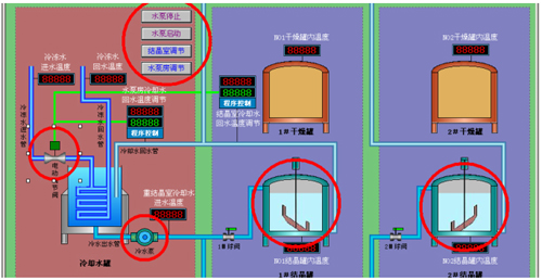 上圖是某結(jié)晶罐的結(jié)晶控制系統(tǒng),在該系統(tǒng)中(紅色框部分)使用了一臺AI-301ME5L5L5L4I5I5用了9個I/O點,4個輸出點用于手動控制水泵的啟停和水溫調(diào)節(jié)的方式,5個輸入點用于采集顯示攪拌電機旋轉(zhuǎn)、冷水泵動作及調(diào)節(jié)閥的狀態(tài)用動畫來顯示。