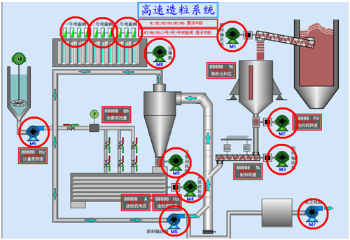 在某高速造粒監(jiān)控系統(tǒng)中使用了2臺AI-301ME5I5I5I5I5I5S來采集顯示12個開關(guān)量輸入點,主要是各種風機和電磁閥的狀態(tài)。