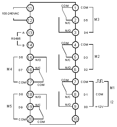 AI-301M有6個模塊插座,你可以按照不同功能選擇模塊實現(xiàn)對開關(guān)量信號輸入輸出的功能。其中COMM(RS485)專用于安裝通訊模塊與計算機通訊;其他M1、M2、M3、M4、M5都可以安裝2路開關(guān)量輸入或1/2路繼電器輸出模塊,其中M1還可以安裝I2頻率輸入模塊。
